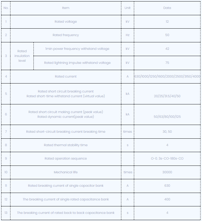 VSG-12 ह्यान्डर्बर्ट प्रकार भ्याकुम सर्किट ब्रेकरर प्राविधिक प्यारामिटर